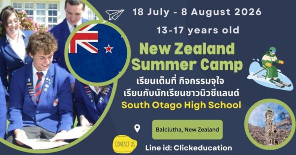 เรียน winter camp ที่นิวซีแลนด์ สถาบัน South Otago High School เมือง Balclutha ประเทศ New Zealand 18 กรกฎาคม – 8 สิงหาคม 2569 (3 สัปดาห์) สำหรับนักเรียนอายุ 13 – 17 ปี เรียนเต็มที่ กิจกรรมจุใจ เรียนกับนักเรียนชาวนิว
